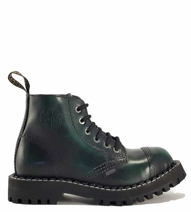Steel Boty 6 dírkové. Kvalitní originální punková kožená obuv Steel s ocelovou špičkou. Podešva je  z tvrzené gumy, flísová lepená stélka. Výška obuvi: 16,72 cm, podešva pod patou 3,73 cm podešva pod špičkou 2,73.