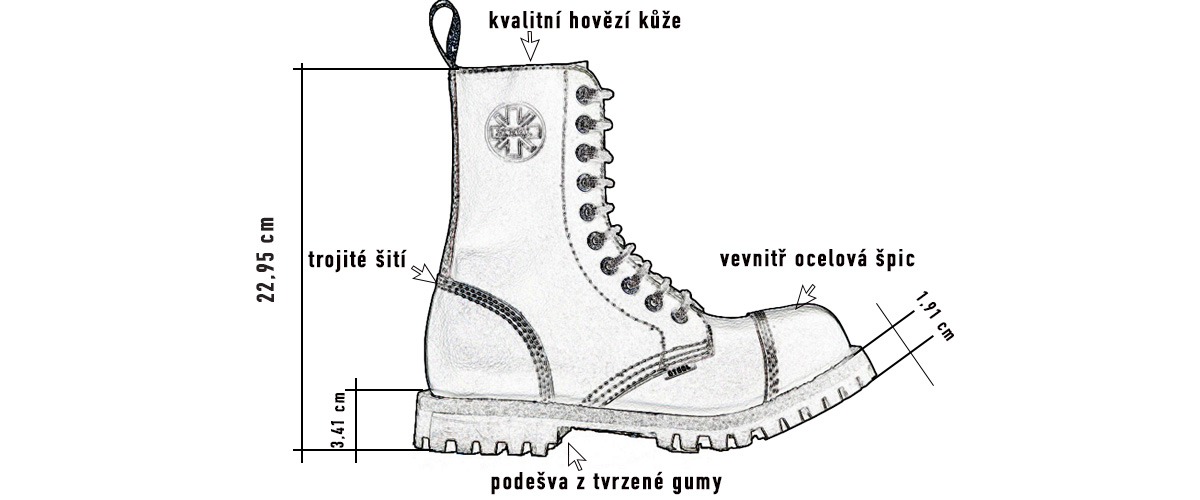 Steel boty 10 dírkové černé. Kvalitní originální punková kožená obuv Steel s ocelovou špičkou. Podešva je z tvrzené gumy, flísová lepená stélka. Výška obuvi: 22,95 cm, podešva pod patou 3,41 cm podešva pod špičkou 1,91 cm